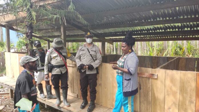JAYAPURA, Monitorpapua.com – Akhirnya kandang ternak babi milik Regina Belau telah dirampungkan Binmas Noken Polri, dipimpin langsung Koorwil Binmas Noken Intan Jaya Ipda Arisandi Tancoma SH yang bertempat di Kampung Bilogai Distrik Sugapa, kabupatan Intan Jaya, Kamis (9/6).