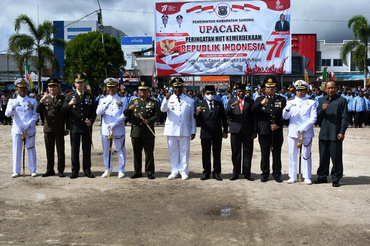 upacara dilaksanakan dengan tertib, aman dan lancar, bertindak selaku Inspektur upacara Bupati Kab. Sorong DR Jhony Kamuru, S.H. M.Si., Rabu 17 Agustus 2022.