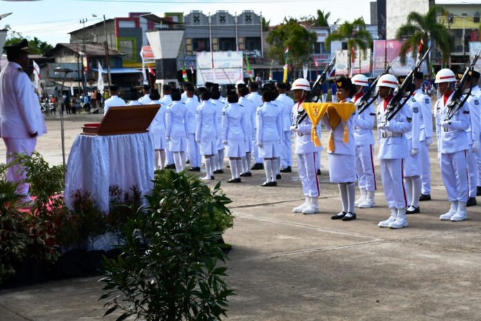 Prosesi pengibaran Bendera Merah Putih oleh Tim Pasukan Pengibar Bendera (Paskibra) Upacara Peringatan Detik-detik Proklamasi Kemerdekaan Republik Indonesia, yang telah di kukuhkan Bupati Sorong sehari sebelumnya berjalan dengan sukses.