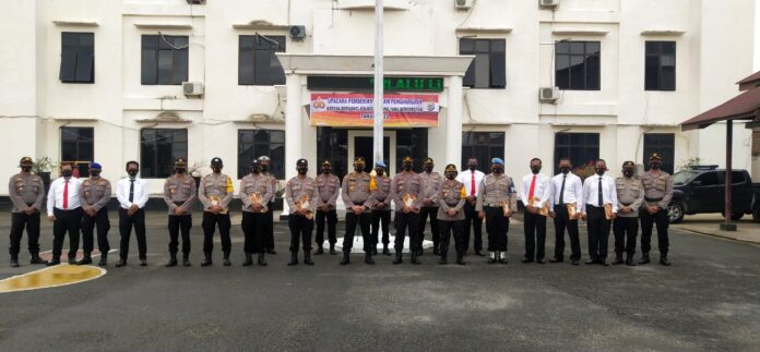 SORONG AIMAS, Monitorpapua.com – Kapolres Sorong AKBP Robertus A. Pandiangan, S. Ik., MH pimpin upacara pemberian piagam penghargaan atau Reward kepada Kapolsek Salawati Ipda Dristica Brian Arya Leviantona, S.Tr.K, MM beserta 7 personil, bertempat dilapangan apel Mapolres Sorong, Senin (15/02/2021) pukul 08.30 Wit