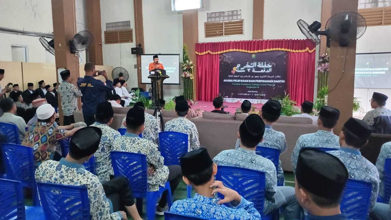 SORONG, Monitorpapua.com – Kepala Kantor Kementerian Agama Kota Sorong, Rofiul Amri, S.Pd., M.Pd.I., menghadiri sekaligus melepas sebanyak 20 orang Santri dari Pondok Pesantren Cahaya Islam Papua Kota Sorong, Rabu, 15 Mei 2024 disaksikan Kepala Dinas Pendidikan dan Kebudayaan, Rektor IAIN, Rektor UMS, Rektor Universitas Muhamadyah atau yang mewakili, Ketua Yayasan Cahaya Islam, Ketua Dewan Pengawas Cahaya Islam serta orangtua santri di Pondok Pesantren Cahaya Islam.