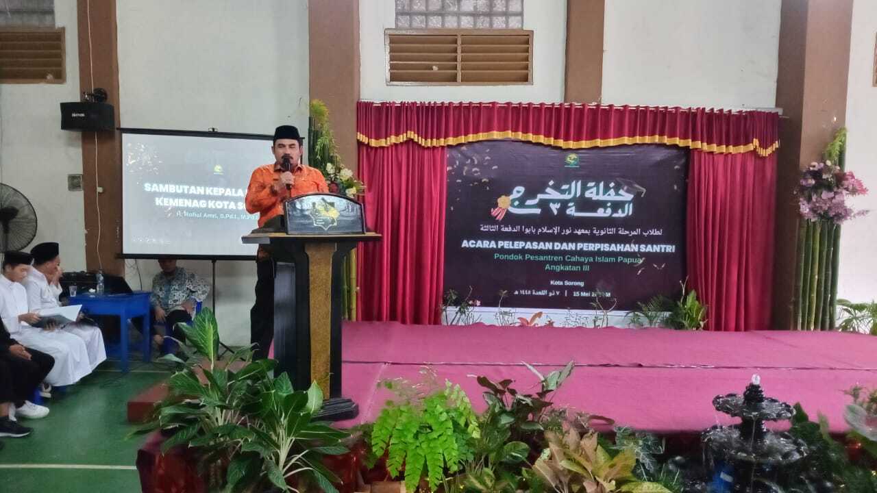 “Kementerian Agama Kota Sorong bangga dan terhormat karena diundang menghadiri pelepasan para Santri Cahaya Iman Papua Kota Sorong ini. Pesantren ada karena ada Kementerian Agama. Maka mari kita memberikan motivasi kepada anak didik ini. Mereka sudah belajar selama 6 tahun di Pesantren (SMP-SMA) Cahaya Islam,” ucap Rofiul Amri.
