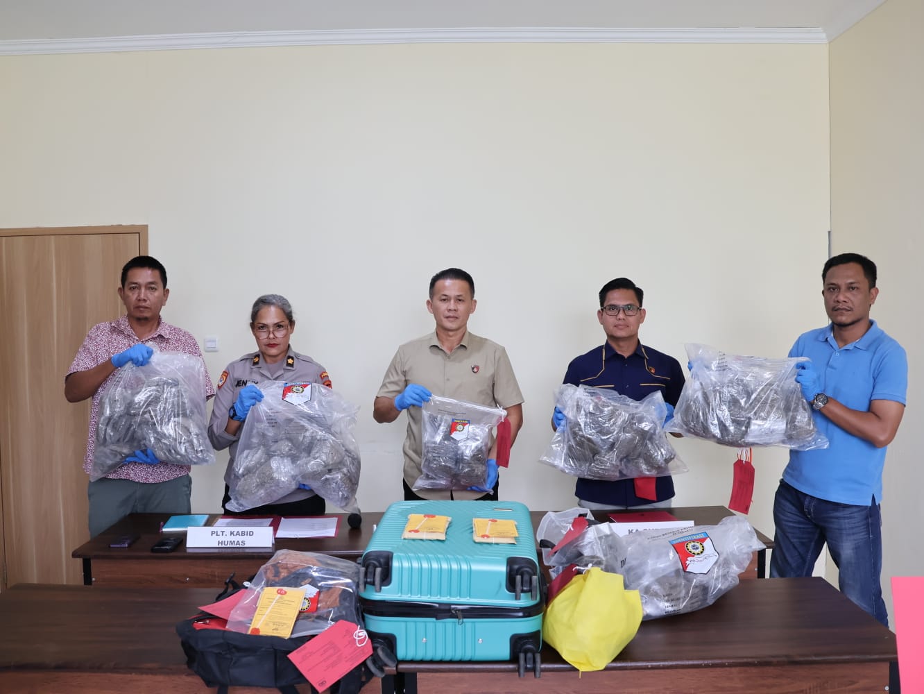 Dari tangan keduanya, polisi menyita barang bukti ganja dengan total berat mencapai 3.166,48 gram yang dikemas dalam ratusan plastik bening ukuran besar. Selain itu, turut diamankan sejumlah barang pendukung berupa beberapa tas (ransel, koper, dan tas jinjing), dua buah lakban bening, serta satu unit telepon seluler merek Samsung Galaxy A17.